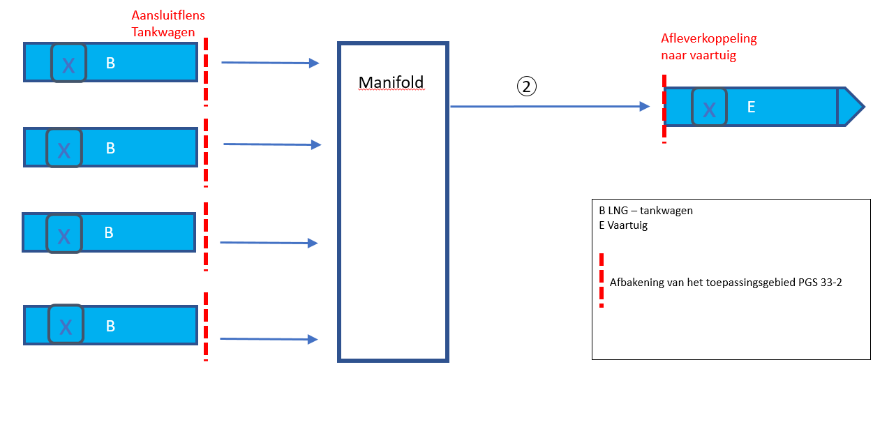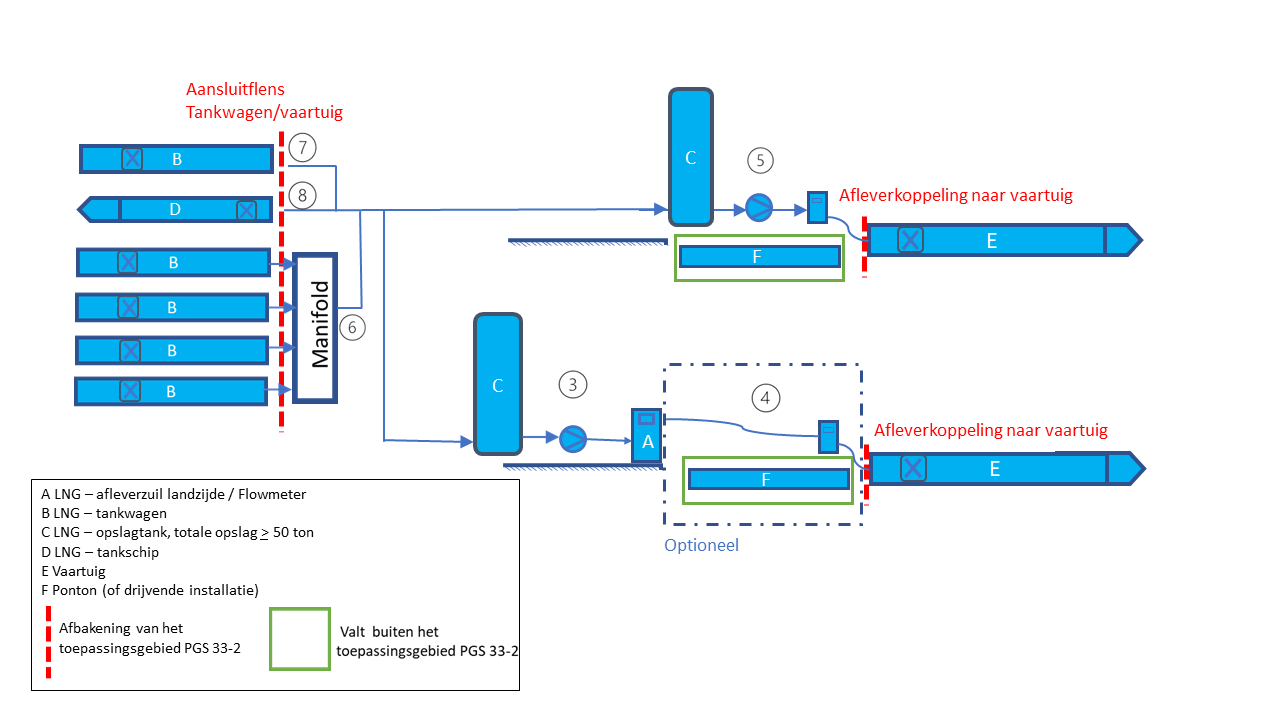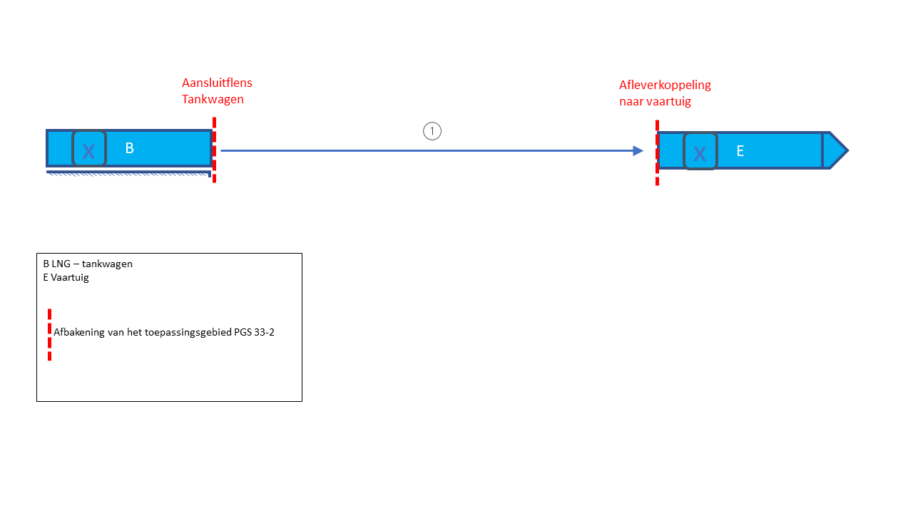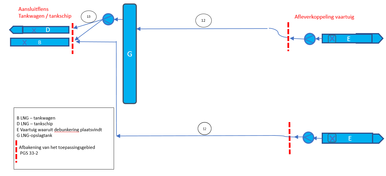 Voor het rechtstreeks bunkeren vanuit een LNG-tankwagen naar de brandstoftank van een schip is PGS 33-2 voor de volgende situaties van toepassing (zie Afbeelding 1 en Afbeelding 2):