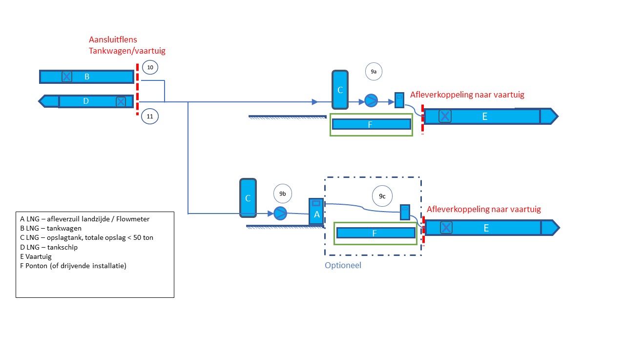 Voor het bunkeren vanuit een LNG-opslagtank, waarbij de totale inhoud van de LNG-opslagtank en de brandstoftank van het met LNG aangedreven schip samen gelijk aan of groter is dan 50 ton, is PGS 33-2 voor de volgende situaties van toepassing (zie Afbeelding 3):